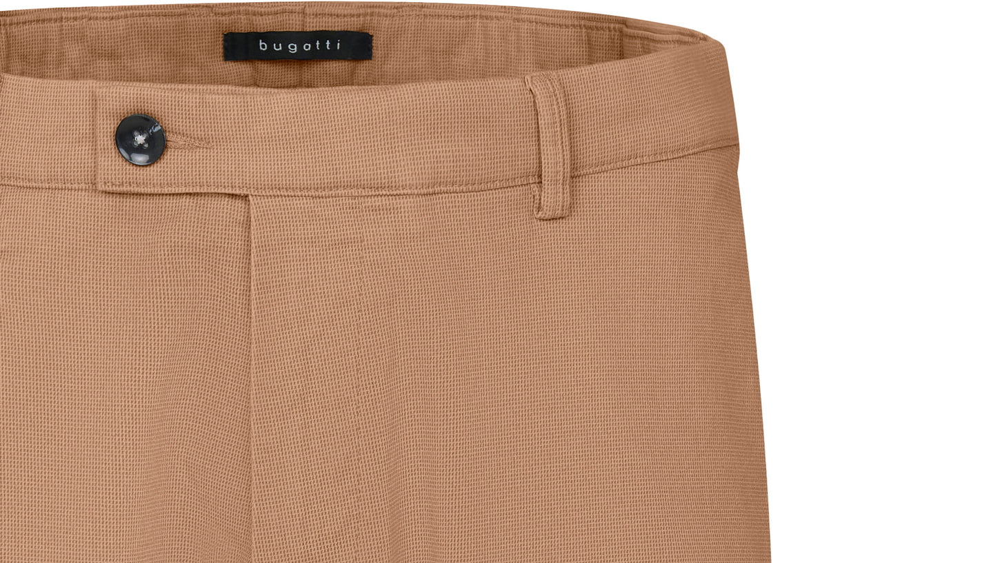 Sophisticated and comfortable, Bugatti pants have you covered for every occasion. 53% Cotton, 29% Polyester, 16% Viscose, 2% Elastane Soft with stretch for comfort. Mid weight. Zip fly. Modern Fit Brand: BugattiProduct code: 4890-66351B Light Brown